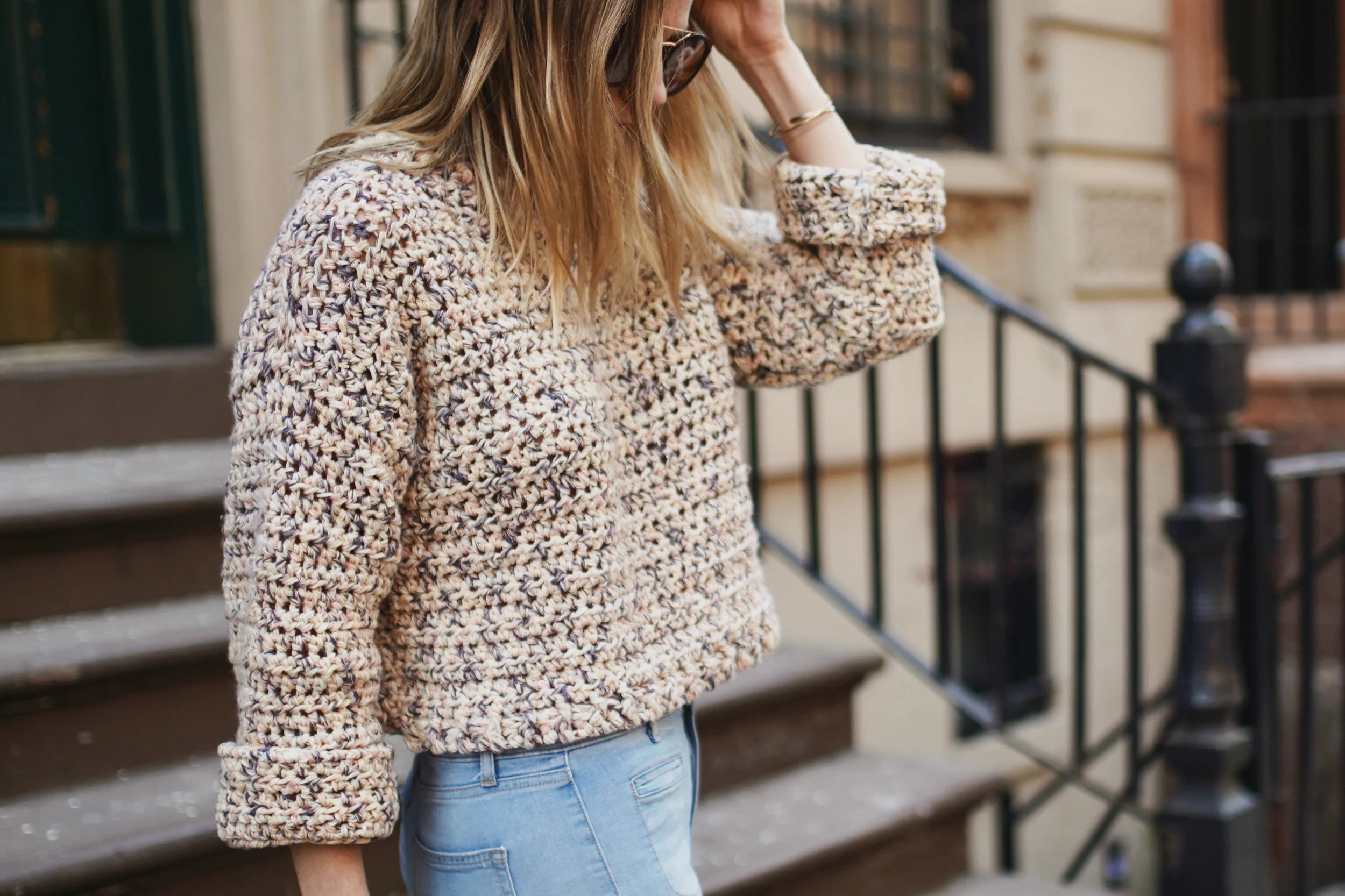 With long, wide sleeves that can easily be rolled up, a cropped body, and chunky doubled yarn that's crocheted super loose, this boxy sweater is the perfect addition to a shady spring afternoon or post-beach cocktails. And best of all it's a simple pattern that works up in less than a weekend! The front and back are worked as one piece without any side shaping, so it really does whip up before your eyes.