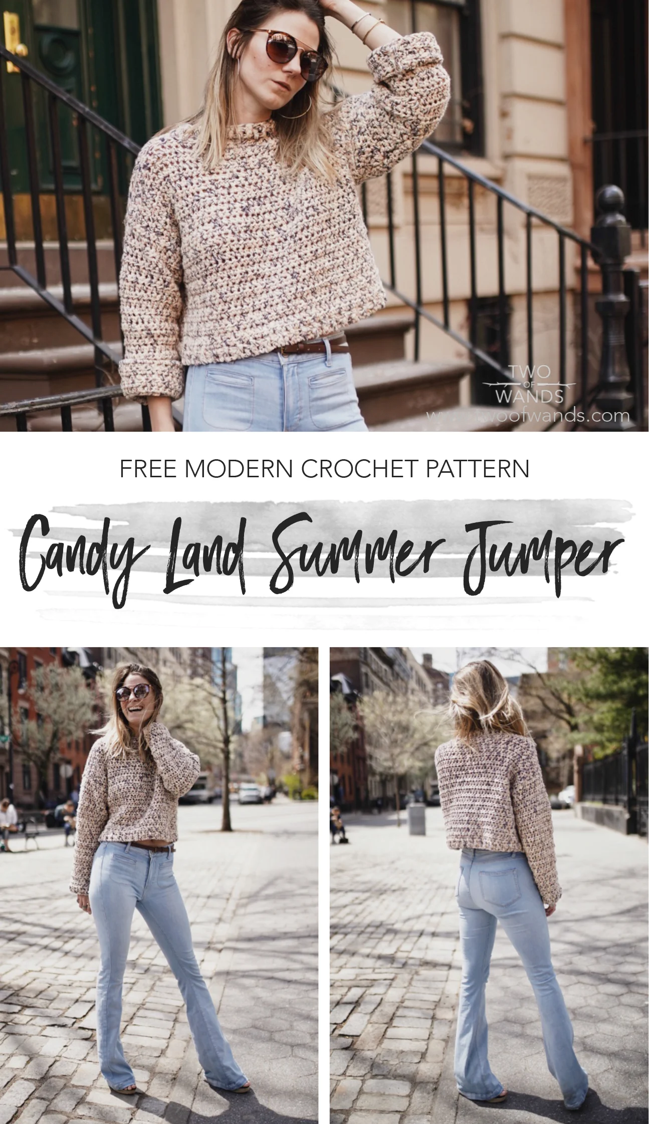 I chose the "Keepsake" colorway, which has a natural toned neutral base and tiny flicks of light blue, lavender, and pink. The combo is a lovely spring palette and instantly reminded me of swirly lollipops and summer sweets. And thus the Candy Land Summer Sweater was born! I seriously imagined this exact silhouette, and I'm so happy that my original vision came together so perfectly. Read on for a bit more design process deets and the free pattern, or purchase a printable, ad-free PDF here. If you're as excited about this piece as I am, head over to Lion Brand's site to snag your yarn kit here.