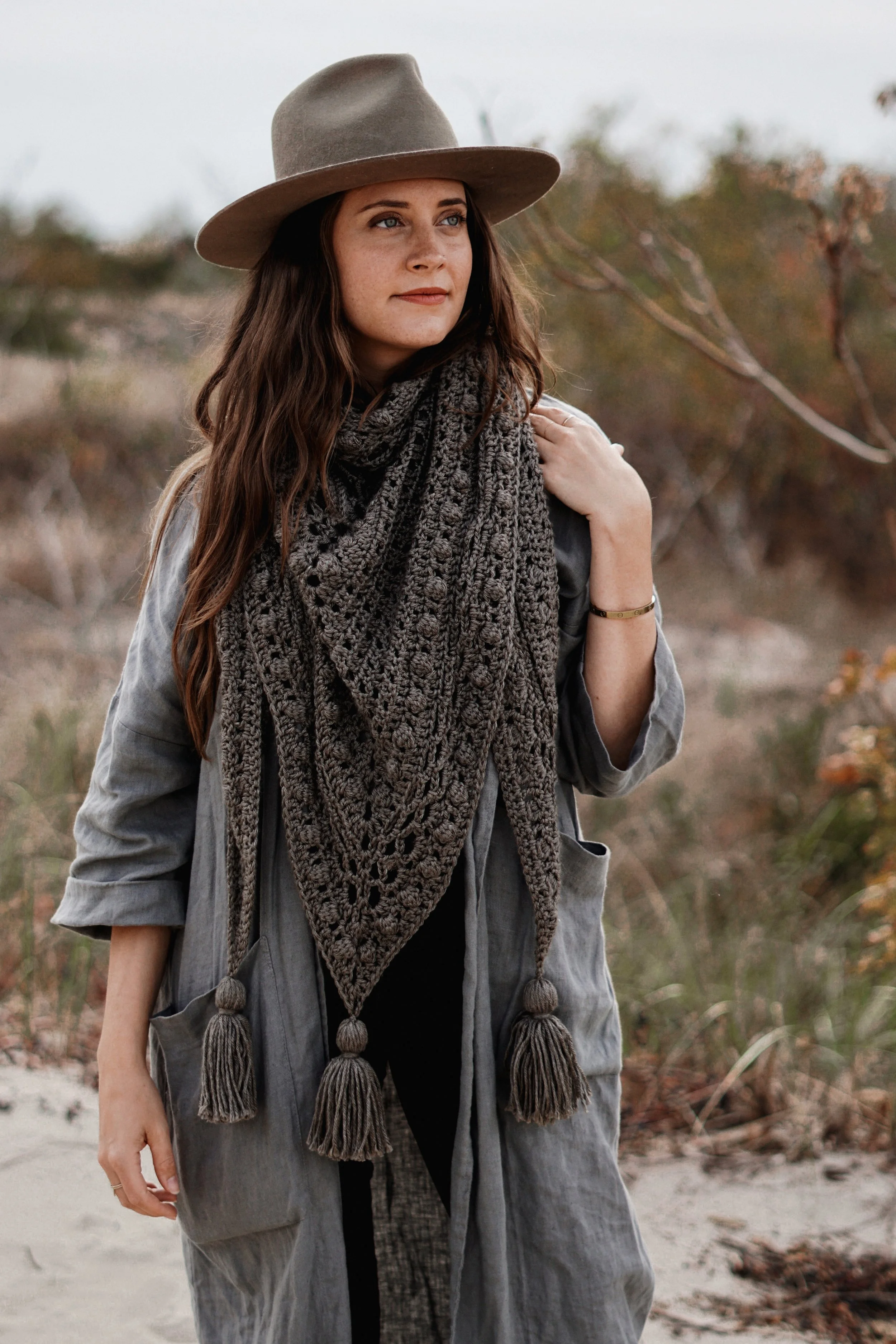 I was living in LA when I designed the knit Cambria Wrap, so the initial inspiration was something large but lightweight enough that it wouldn't be overwhelming in warmer climates. The next design choice was to create different sections of stitch repeats so the wrap would be exciting to keep working on and not get cumbersome with each row just getting longer and longer since I wanted to work it from the top down/center out. I carried both of these ideas over to the new Catalina Wrap and I think it perfectly encompasses what a crochet version of the Cambria Wrap would be.