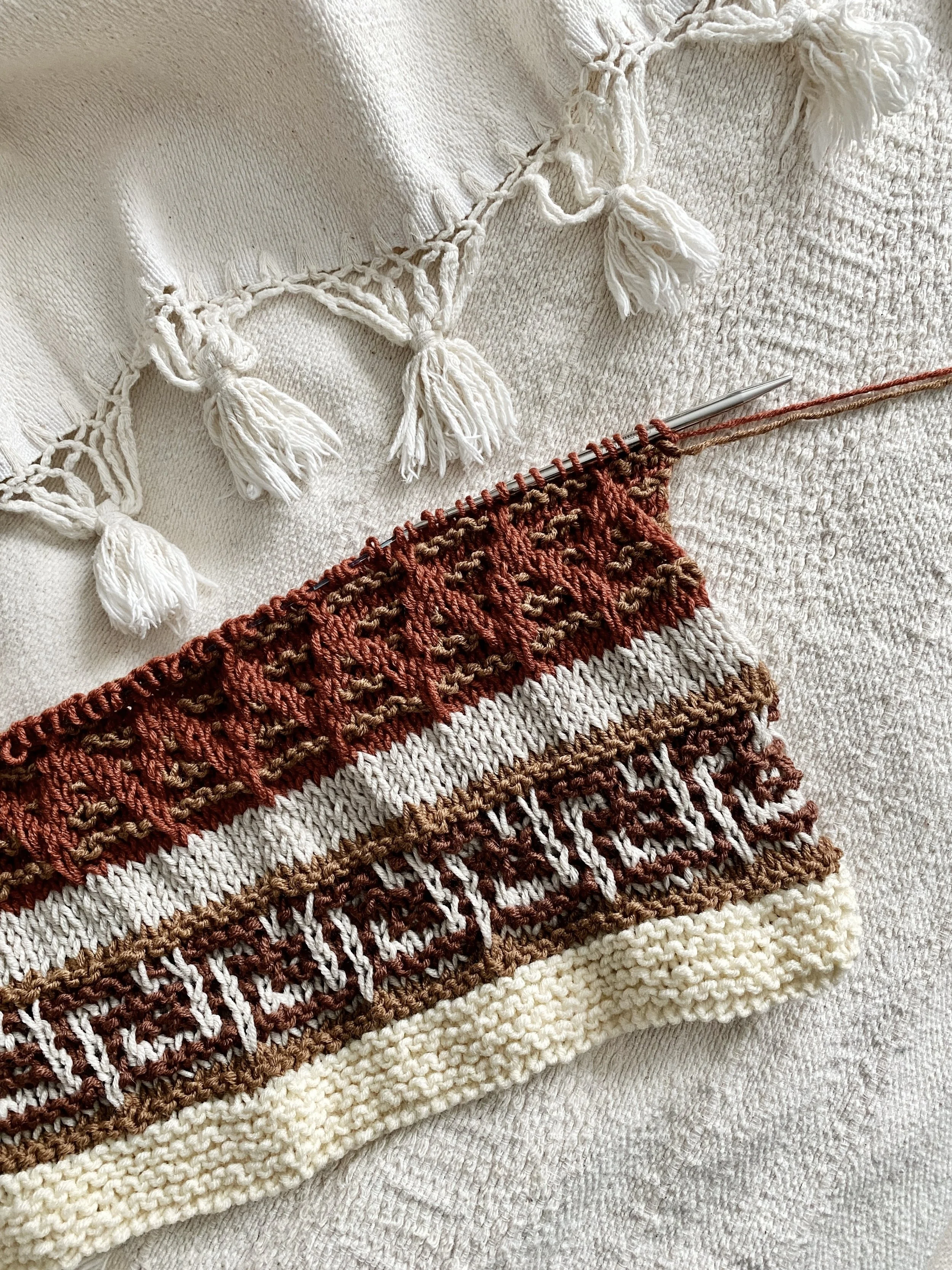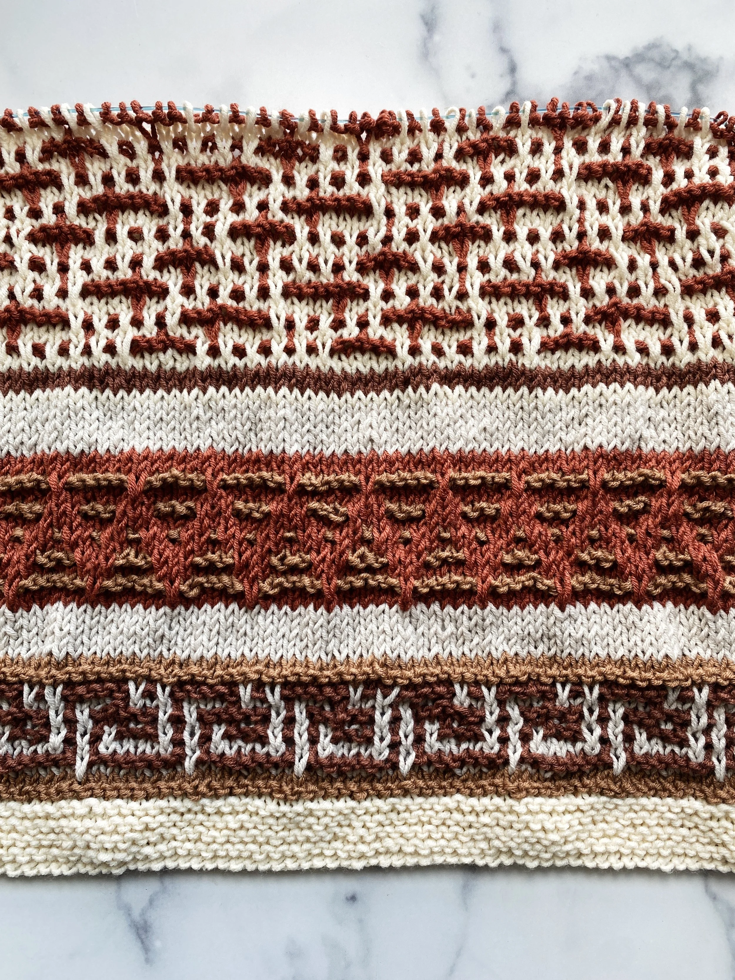 Colors A and E should have high contrast. In the original, these are Natural Heather (A) and Charcoal (E) and for my updated sample these are Ivory (A) and Canyon (E)