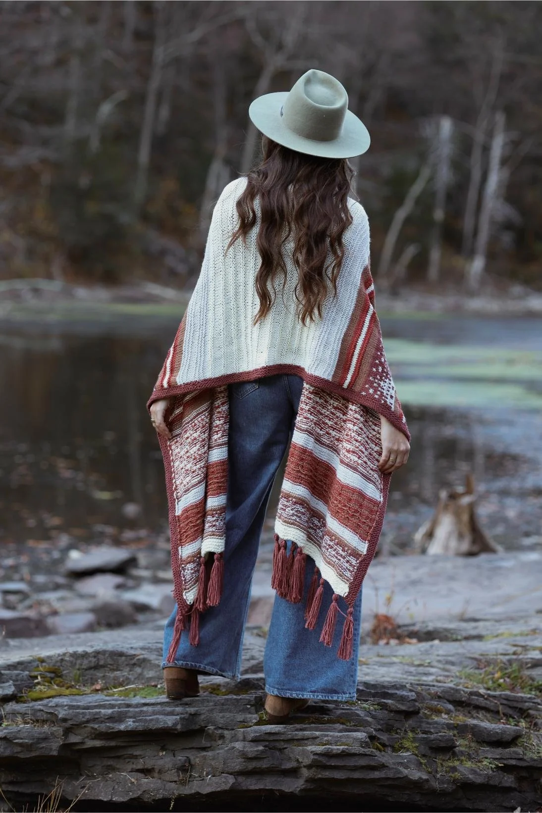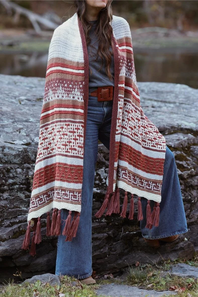 Colors A and D are the dominant colors, since you’ll be using two skeins of each of them and only one skein of each of the other colors. Color A makes up a large portion of the center of the wrap, and color D is used for the edging and the tassels. In the original, these are Natural Heather (A) and Navy (D) and for my updated sample these are Ivory (A) and Raisin (D)