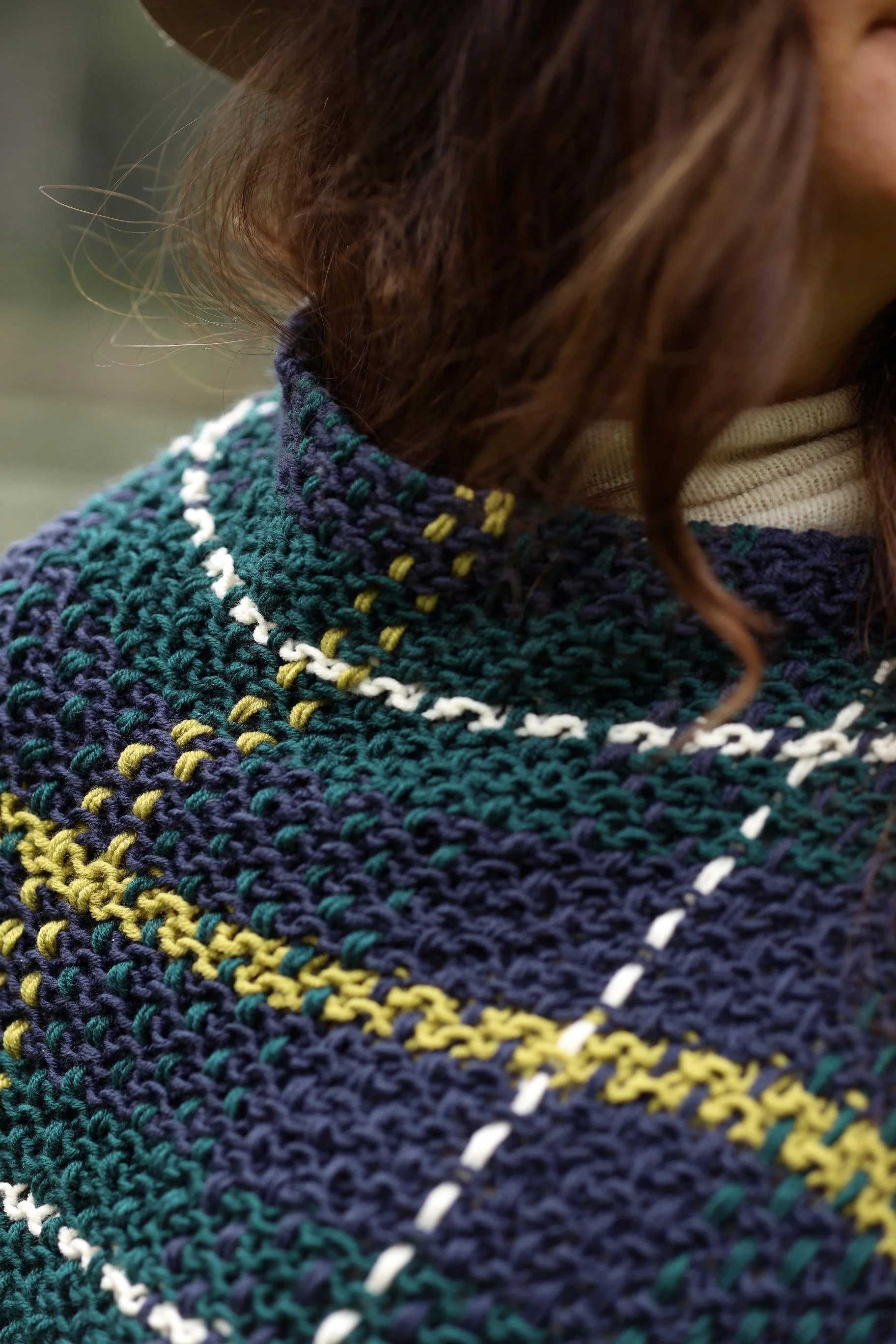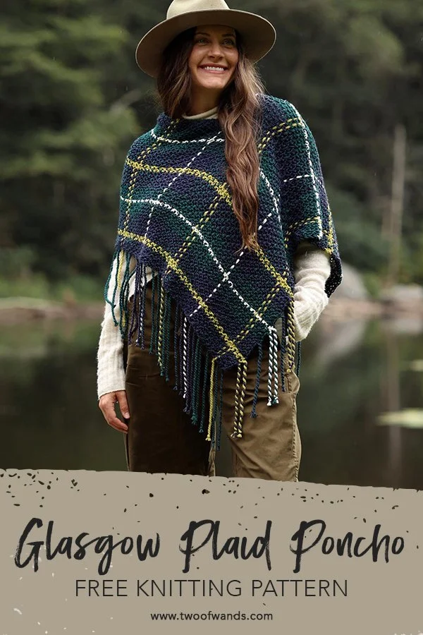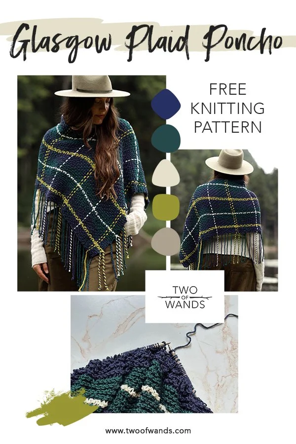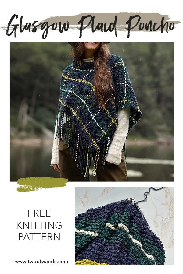 The first two things that come to mind when I think of fall clothes are knitwear (obvi) and plaid. There’s something so classic and elegant about a tartan fabric! So when I started planning my projects for the upcoming fall season, my first instinct was to combine these two themes using a tried and true weaving technique that transforms basic striped garter stitch into mesmerizing plaid. It didn’t hurt that this also gave me the opportunity to showcase the new six colors of Color Theory and a selection of some seriously stunning combos. Without further ado, please welcome the new Glasgow Plaid Poncho! You can find the free pattern below, or you can purchase the printer-friendly PDF here or the full yarn kit with pattern included here. And if you’re looking for the crochet Aberdeen Plaid Poncho, head here.