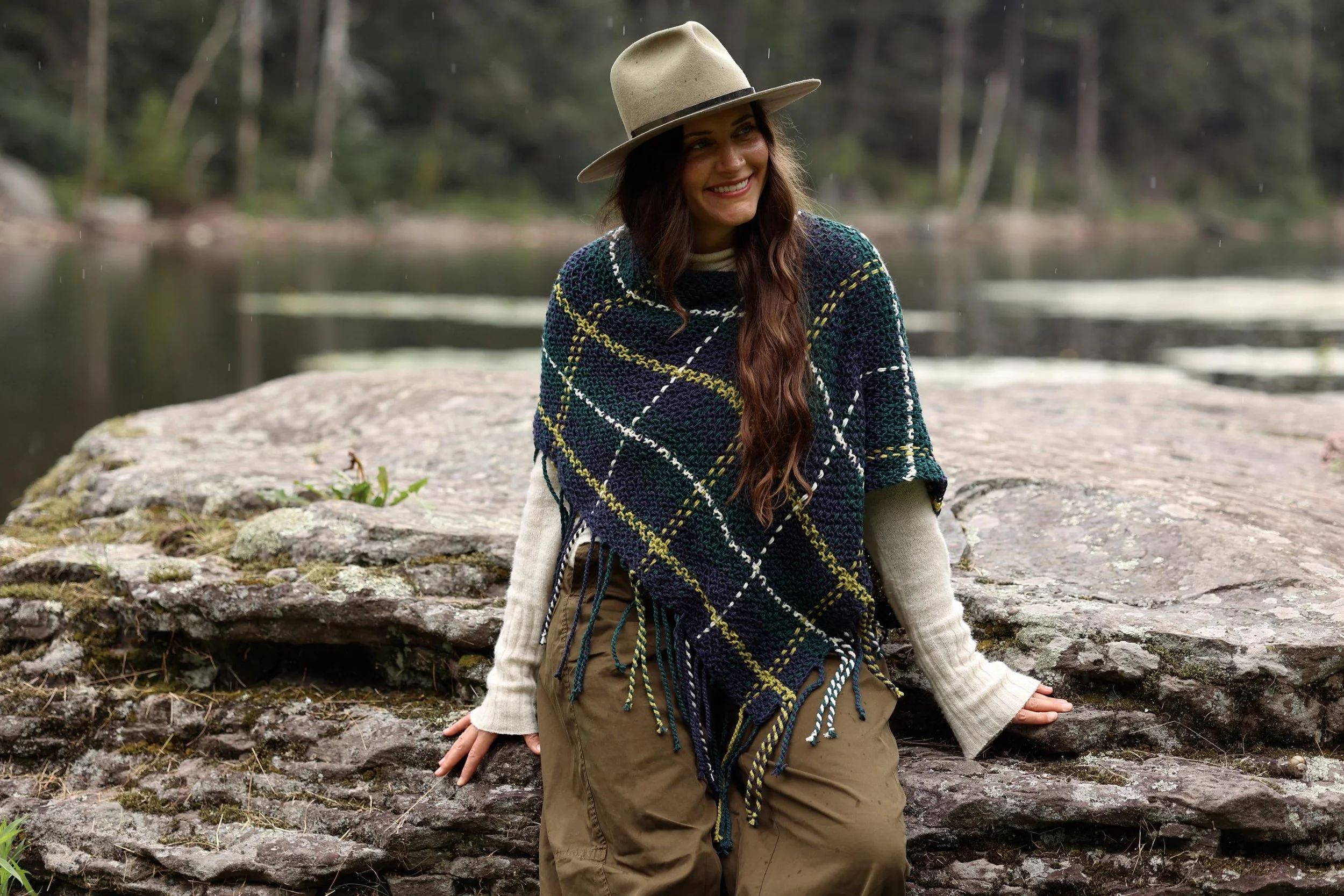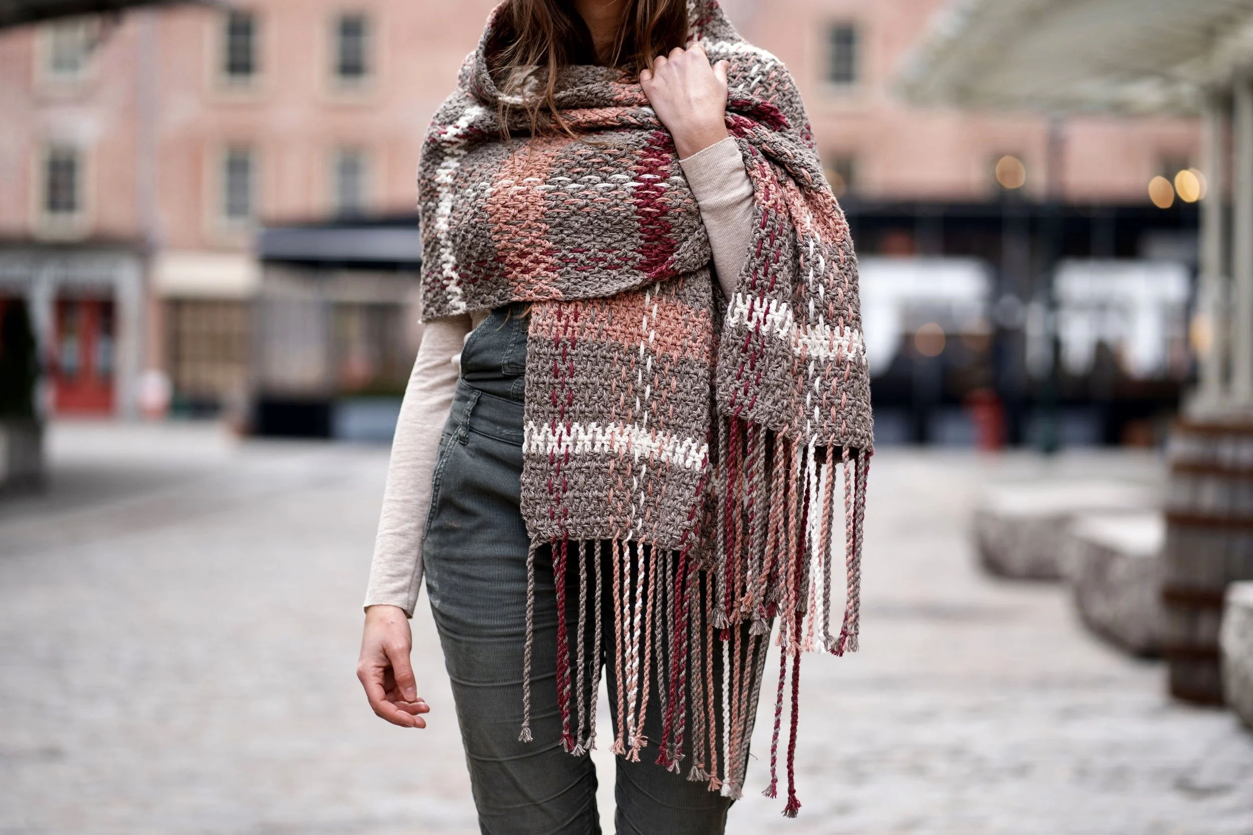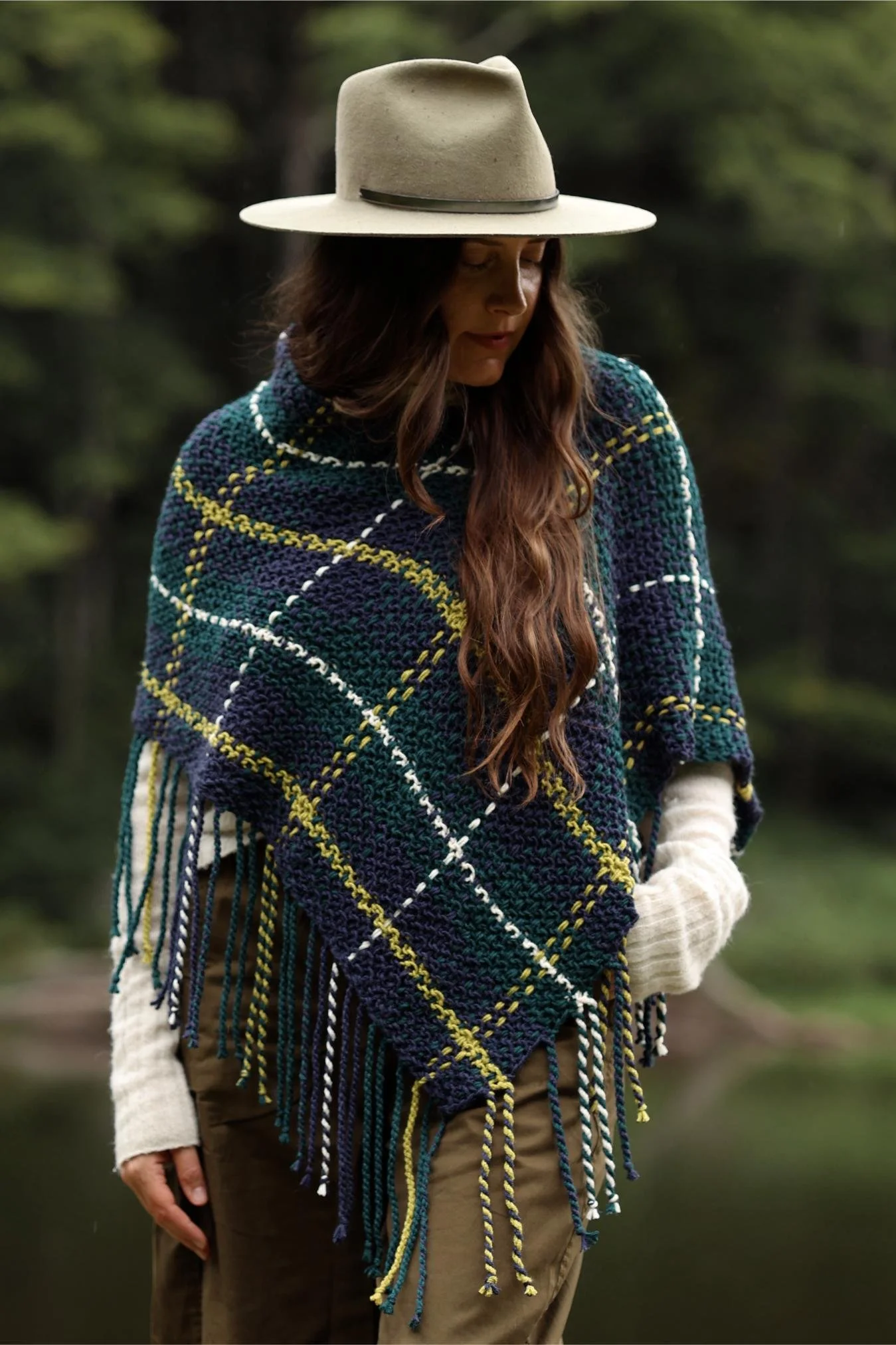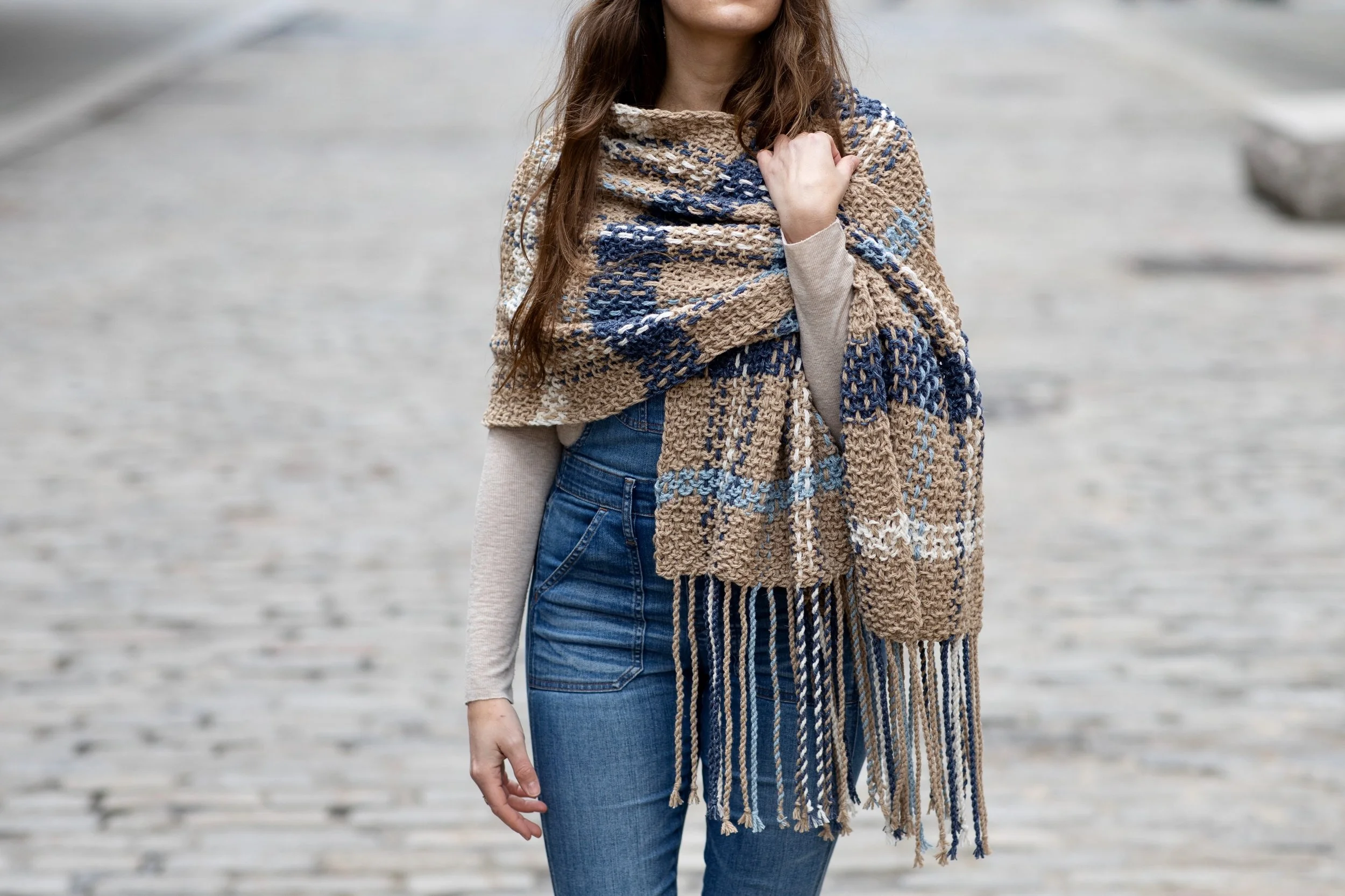 I settled on ponchos for this go round of plaid because I was looking for something that would be effortless to throw on and could be the perfect piece for transitional weather leading up to fall. These are such a lightweight but cozy layer to top any outfit, and it’s the perfect way to cover your shoulders in the event of a slight chill. The twisted fringe adds so much personality, AND it means that there are virtually no ends to weave in (ok, there’s one end to weave in, but in a project with a lot of color changes, that’s pretty miraculous).