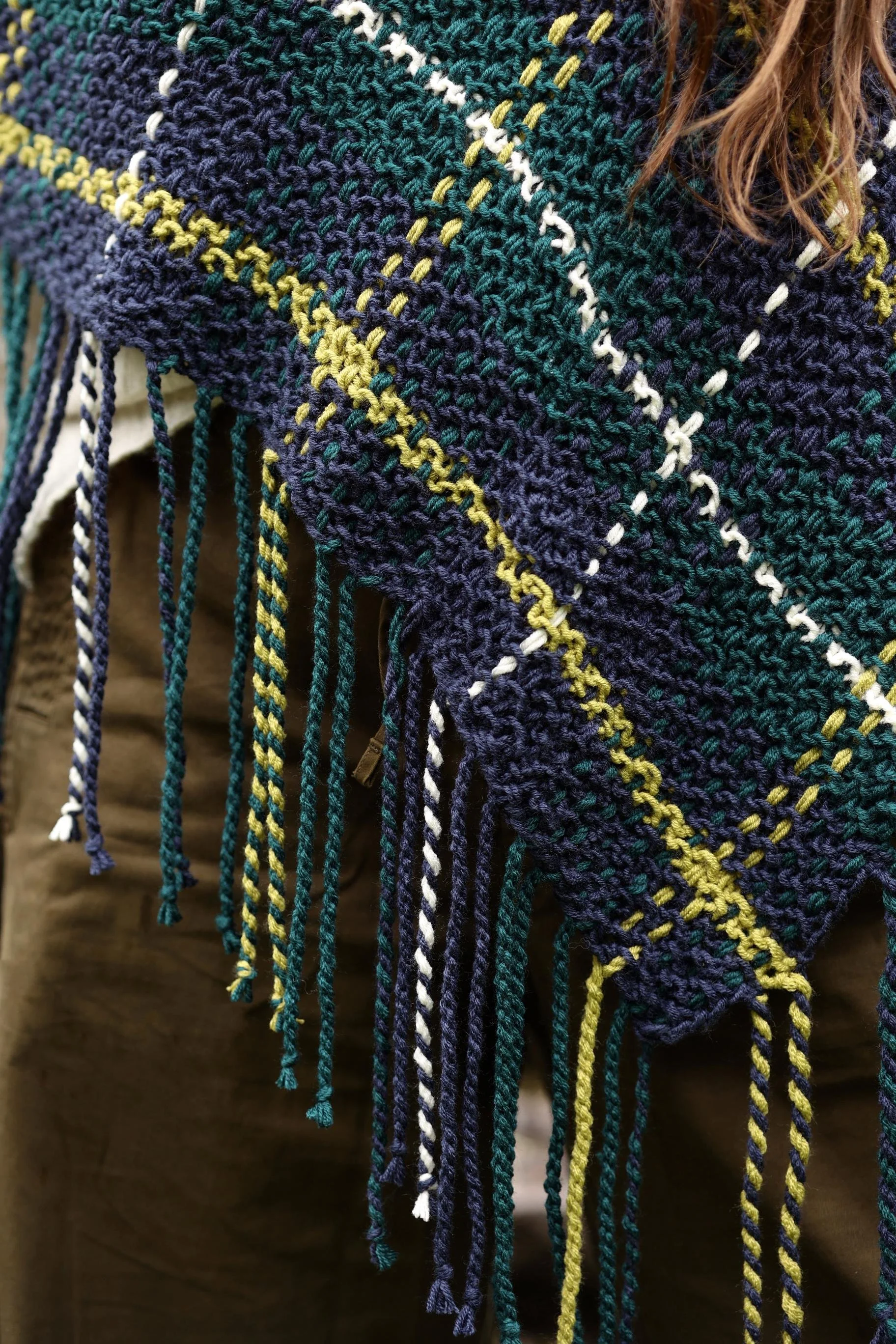 Fold each strand in half and use a lark’s head knot as explained above to attach each next to the corresponding tail colors along the side edges of the poncho. Use the technique above to create twisted fringe, incorporating the tails into the fringe by holding 3 strands together at a time rather than 2.