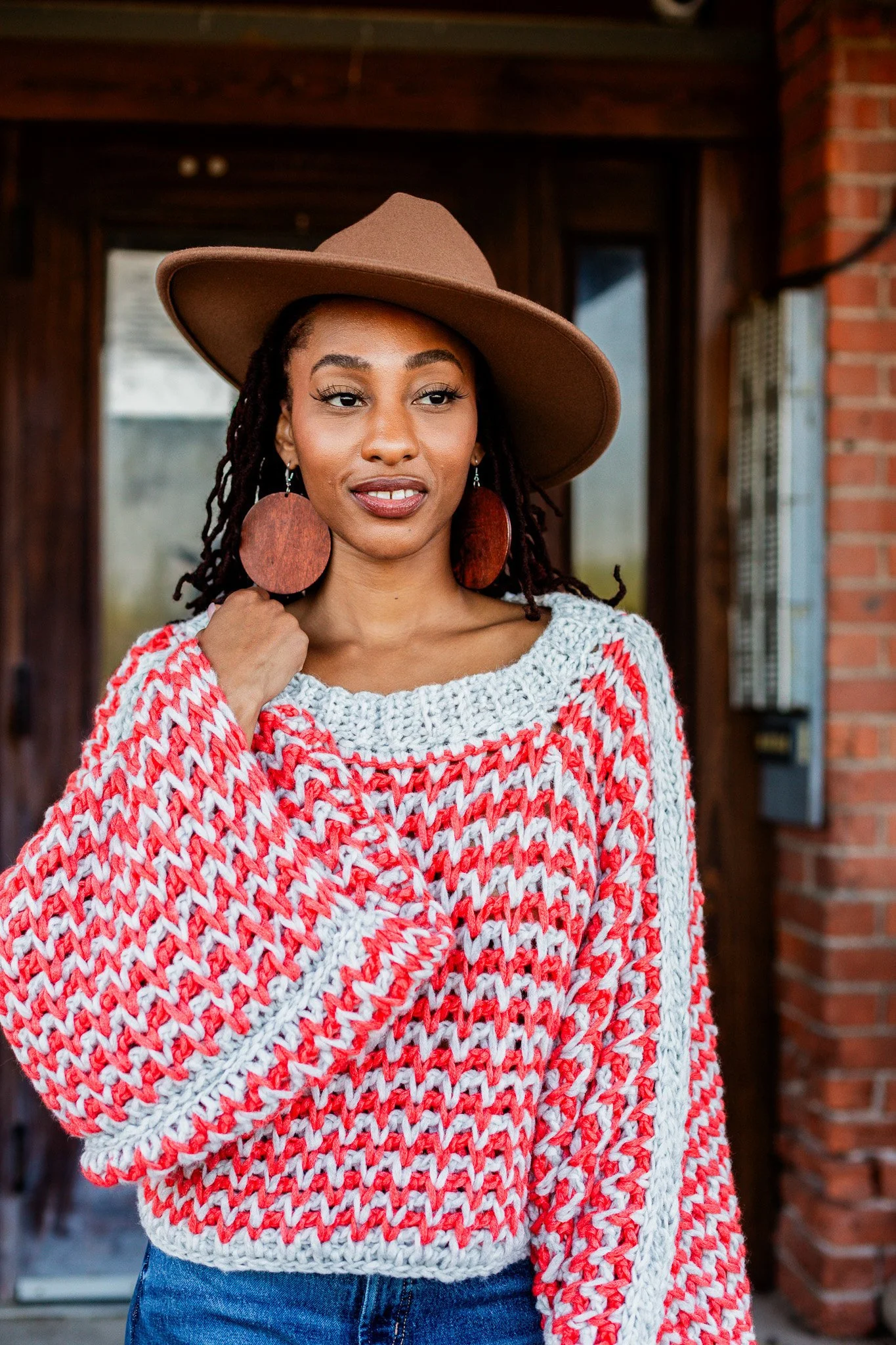 The Glimmer Poncho is where striking texture meets cozy sophistication. Designed by TL Yarn Crafts, this Tunisian crochet poncho brings two-tone flair to chilly days with bold, high-contrast striping and plush bell sleeves that move with elegance. The shaped neckline frames the collarbone just right, while the cropped silhouette offers a modern, wearable fit that layers effortlessly over everything from flowy dresses to high-waisted denim.
