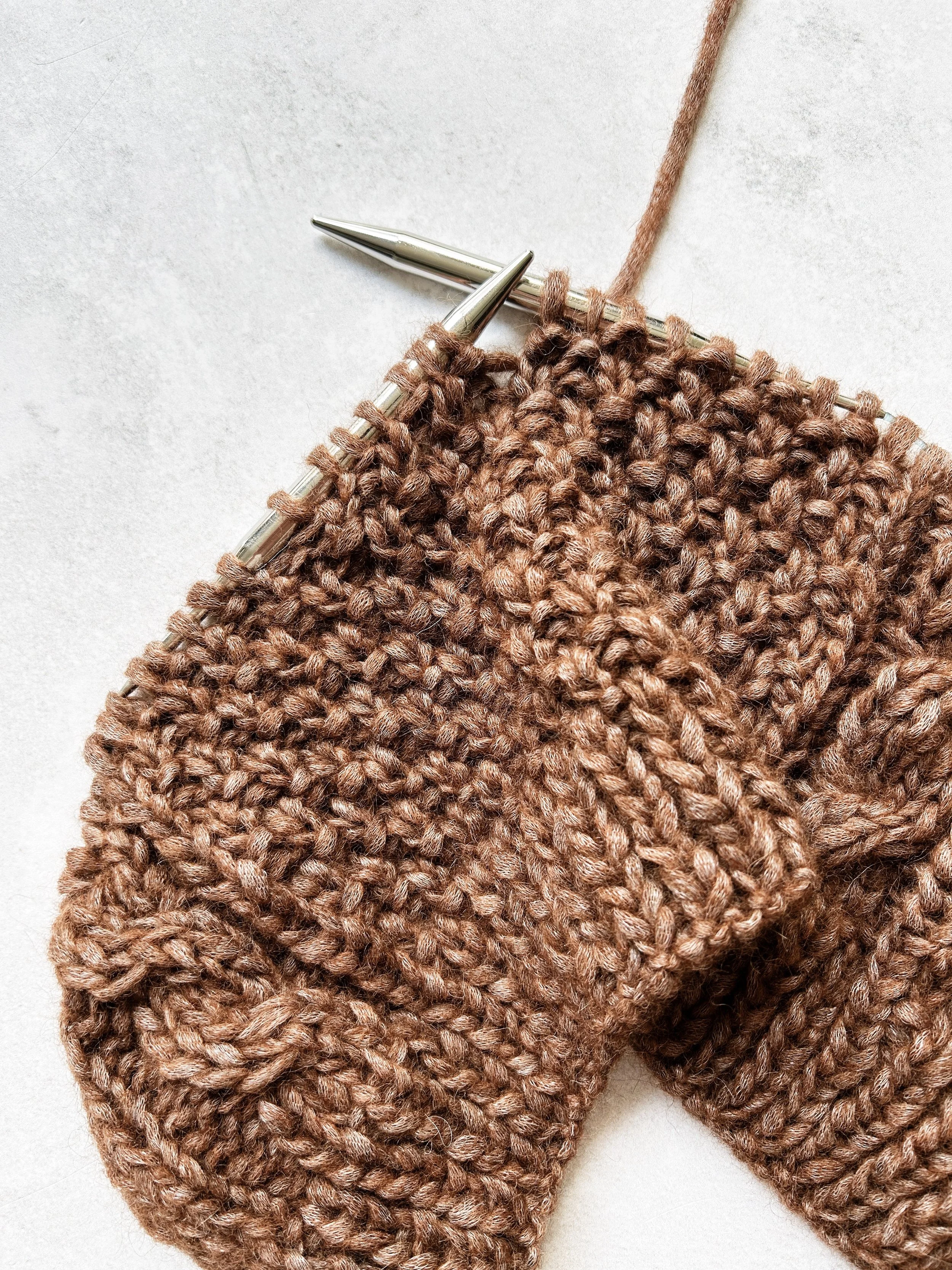 Rows 15-24 (24, 30, 30, 30) (30, 36, 36, 36): Work in pattern as established, working a cable row every 6 rows.